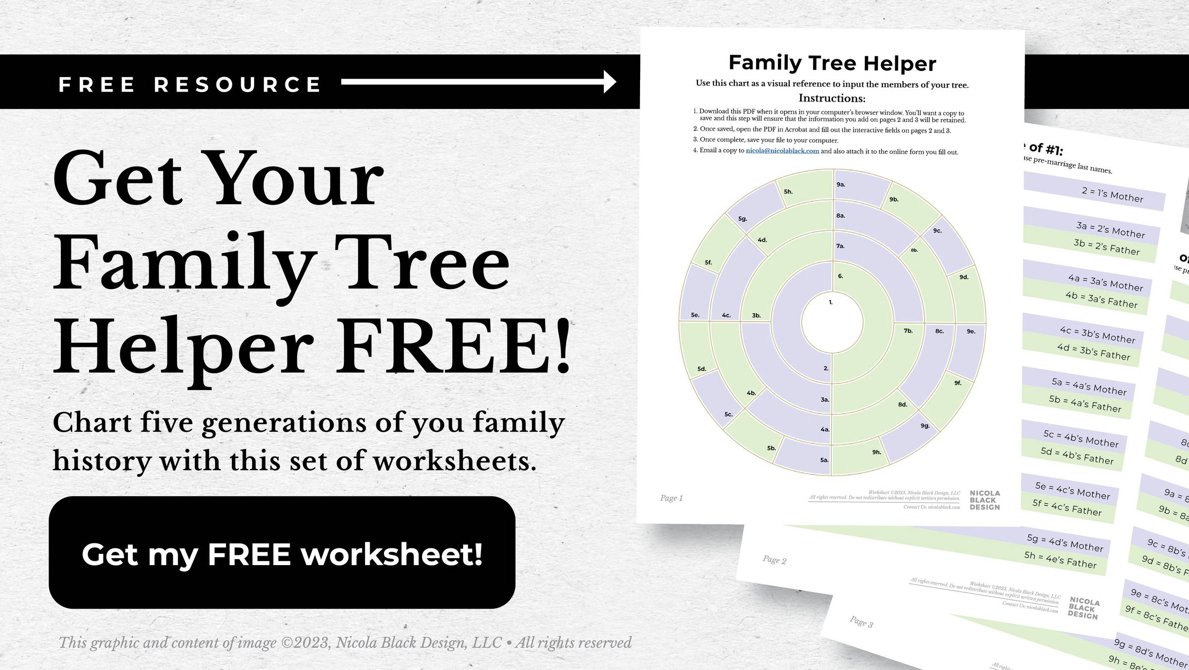 The companion worksheet, my “Family Tree Helper,” is the freebie mentioned above. It acts as a visualization to help keep names in order as well as a confirmation tool for name spelling comparison.