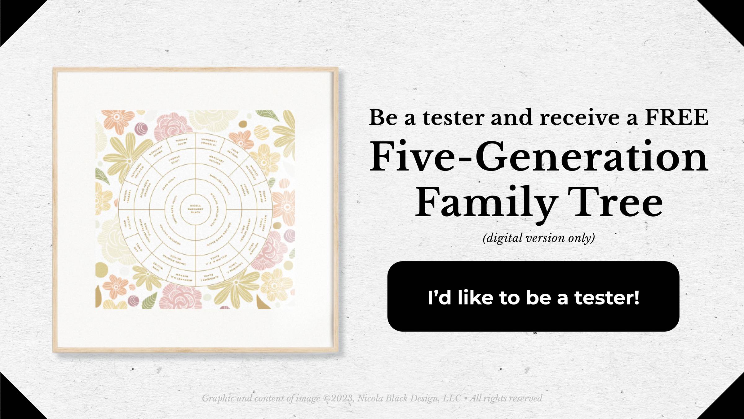 BONUS! After creating the worksheet, I thought I would offer it as a free resource to all of you while I move forward with the rest of the prep. 🥳 Regardless of whether or not you'd like one of my Family Tree designs, the worksheet is a nice standalone to aid in your research. Use it to keep track of five-generations of your family tree.